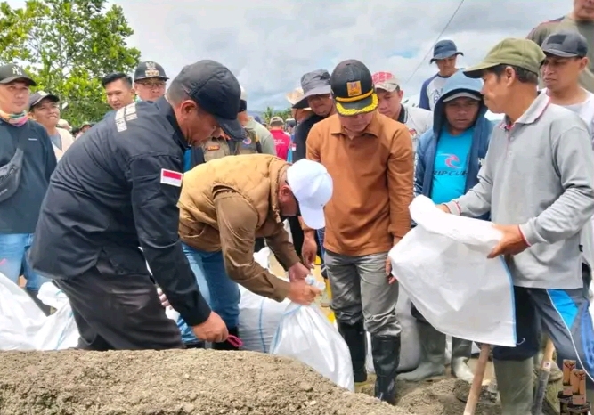 SUNGAI PENUH – Walikota Sungai Penuh, Alfin, SH, turun langsung ikut serta dalam kegiatan gotong royong bersama masyarakat Desa Paling Serumpun dan Desa Simpang Tiga Kecamatan Hamparan Rawang untuk membangun tanggul darurat di tepian Sungai Batang Marao, Sabtu (29/11).