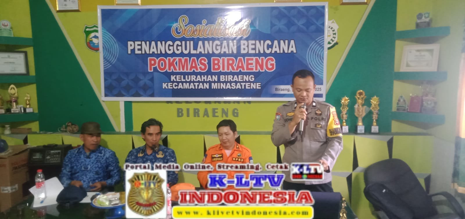 PANGKEP-KLTV INDONESIA klivetvindonesia.com,Bhabinkamtibmas Kel Biraeng Polsek Minasatene Polres Pangkep Aiptu Udhin Syamsuri bersama seketaris BPBD Kab Pangkep Bapak Muhammad Arsyad, S.Kom Melaksanakan kegiatan Sosialisasi pelatihan penanggulangan bencana alam yang digelar di Aula Kantor Kelurahan Biraeng, kec Minasatene, Kab.Pangkep pada hari Senin (01/12/2025) pukul 09.00 wita