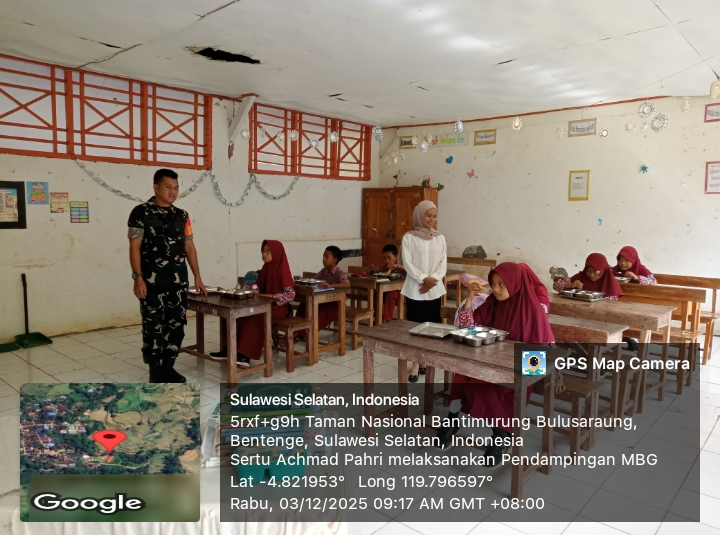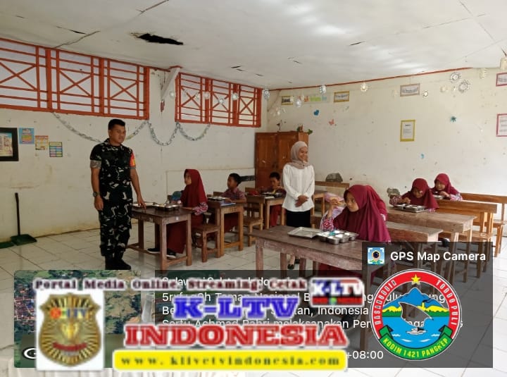 klivetvindonesia.com, Pangkep Desa Lanne, Tondong Tallasa — Program Makan Bergizi Gratis (MBG) kembali dilaksanakan di wilayah Desa Lanne, Kecamatan Tondong Tallasa, Kabupaten Pangkep. Pada Rabu, 03 Desember 2025 pukul 08.17 WITA, Babinsa Desa Lanne, Sertu Achmad Pahri, turun langsung melakukan pendampingan sekaligus memantau jalannya kegiatan pemberian makan bergizi kepada siswa-siswi SDN 33 Bilango.
