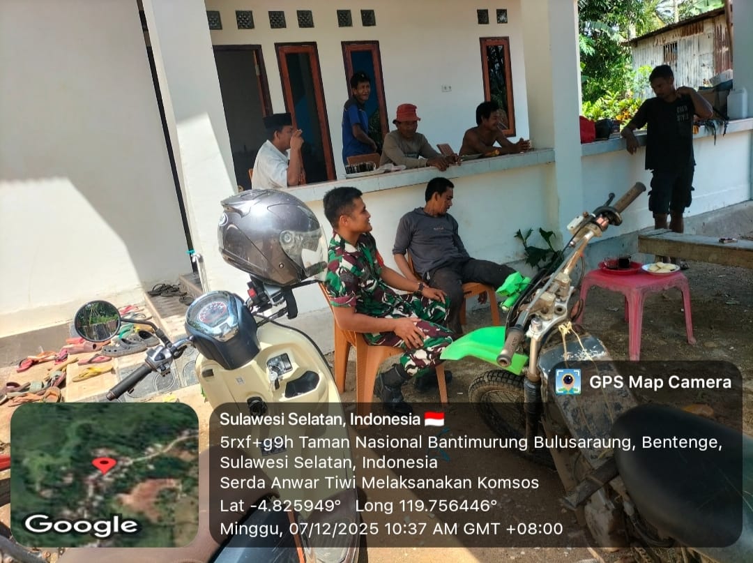 klivetvindonesia.com,Tondong Tallasa, Pangkep — Dalam rangka meningkatkan komunikasi serta mempererat hubungan dengan masyarakat binaan, Babinsa Desa Tondongkura, Serda Anwar Tiwi melaksanakan kegiatan Komunikasi Sosial (Komsos) bersama warga RT 03, RK 05 Dusun Bonto Manai, Desa Tondongkura, Kecamatan Tondong Tallasa pada Minggu, 07 Desember 2025, pukul 10.00 Wita.