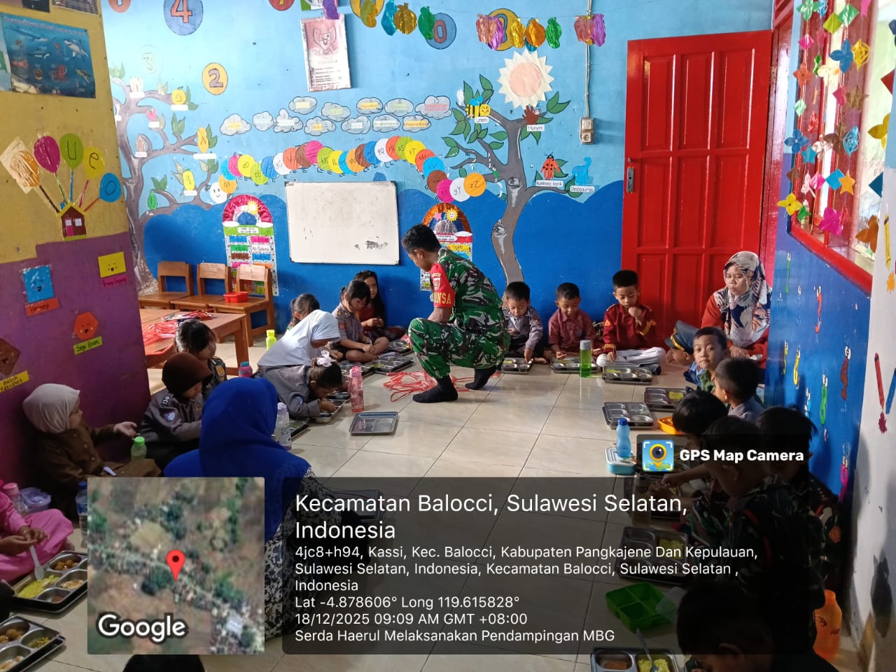 Pada hari Kamis, tanggal 18 Desember 2025, sekitar pukul 08.55 Wita, Serda Haerul selaku Babinsa Kelurahan Kassi melaksanakan kegiatan pendampingan Makan Bergizi Gratis bagi siswa-siswi PAUD KB Melati Kassi yang berlokasi di Kelurahan Kassi, Kecamatan Balocci, Kabupaten Pangkep. Kegiatan ini diawali dengan pengiriman makanan pada pukul 08.00 Wita yang selanjutnya dibagikan kepada para siswa sesuai jadwal yang telah ditentukan.