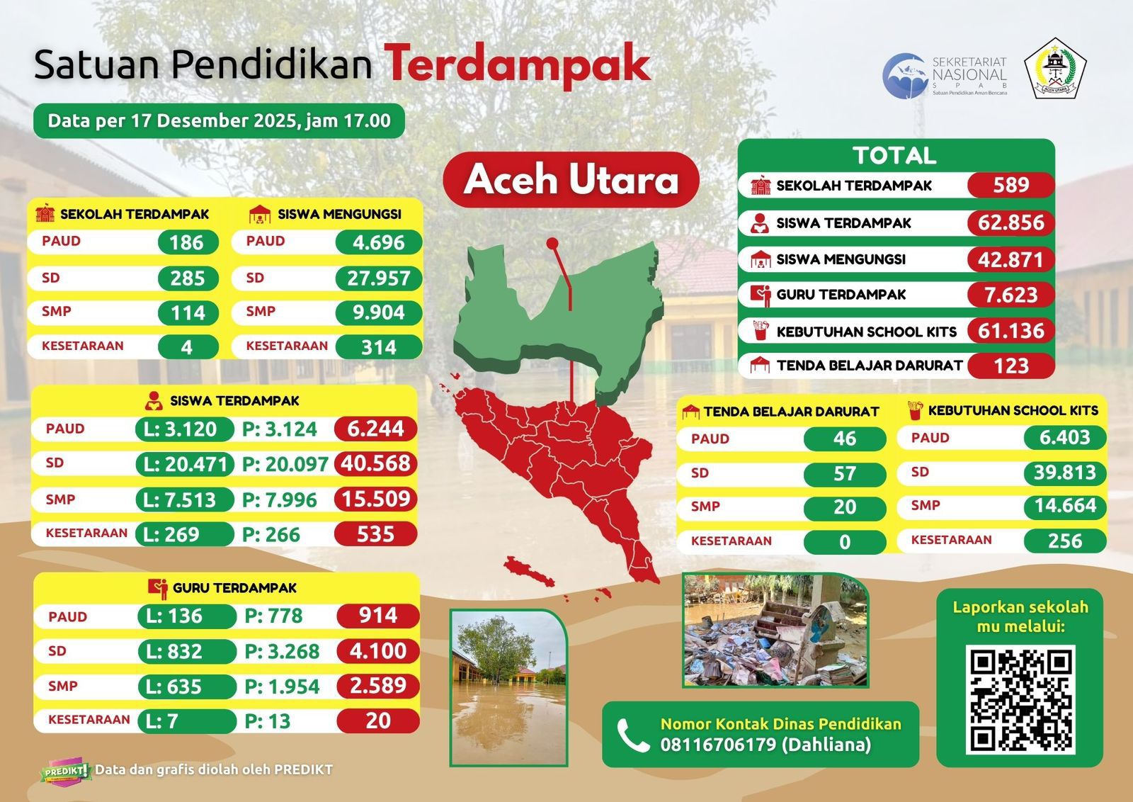 –klivetvindonesia.com– Banjir bandang dan tanah longsor yang melanda Kabupaten Aceh Utara berdampak serius terhadap sektor pendidikan. Berdasarkan data terkini yang dirilis Dinas Pendidikan Kabupaten Aceh Utara per 17 Desember 2025 pukul 17.00 WIB, tercatat sebanyak 589 satuan pendidikan terdampak langsung oleh bencana alam tersebut.
