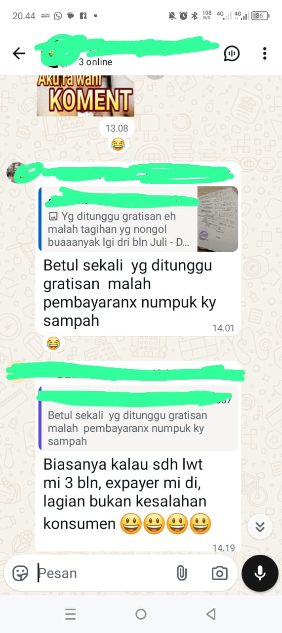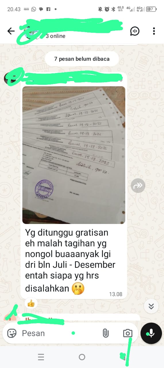 Ungkapan kekecewaan itu dituliskan dengan nada bercampur sindiran. “Yang ditunggu gratisan, eh malah tagihan yang nongol buaaanyak lagi dari bulan Juli sampai Desember. Entah siapa yang harus disalahkan,” tulis warga tersebut dalam pesan yang kemudian memancing respons beragam dari anggota grup lainnya.