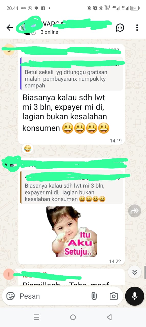 Di sisi lain, beberapa anggota grup mencoba memberi penjelasan. Salah satu warga menuliskan bahwa biasanya jika pembayaran sudah lewat tiga bulan, statusnya dianggap kedaluwarsa (expired), dan hal itu bukan sepenuhnya kesalahan konsumen. Pendapat ini kemudian mendapat dukungan dari warga lain dalam bentuk persetujuan dan stiker.