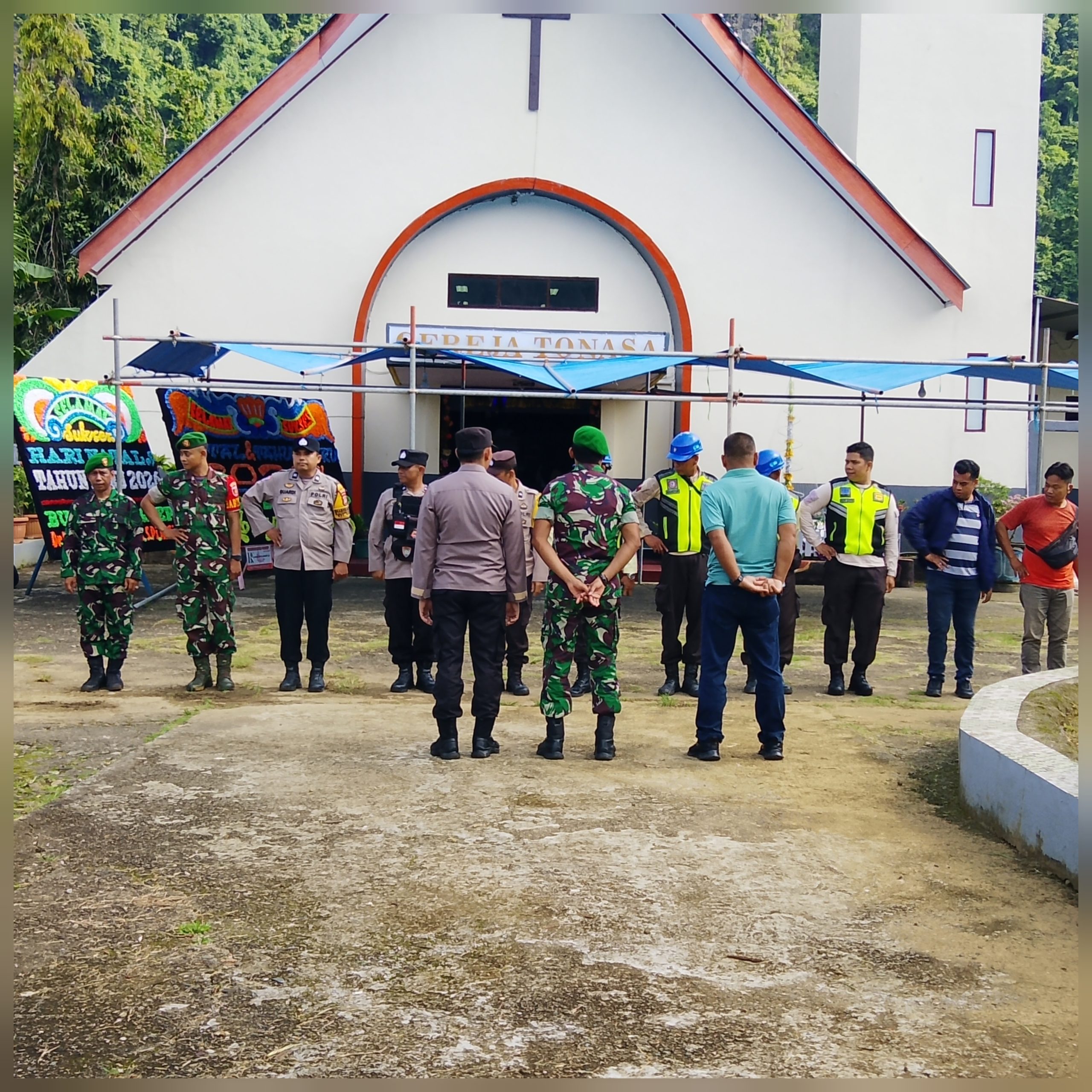 Sejak pukul 08.00 WITA, personel Koramil bersama aparat kepolisian telah tiba dan melakukan pemantauan serta penempatan pengamanan di titik-titik strategis sekitar area gereja, termasuk akses masuk utama, area parkir, hingga titik berkumpul jemaat. Langkah ini dilakukan guna mengantisipasi potensi gangguan keamanan dan menjaga situasi tetap kondusif.