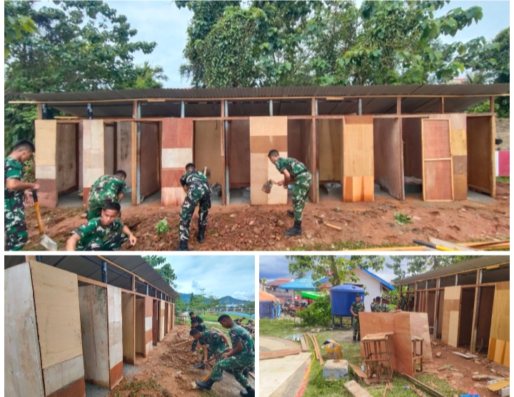 –klivetvindonesia.com– Tapanuli Tengah — Satgas Gulbencal Kodam I/Bukit Barisan melaksanakan pembangunan fasilitas mandi, cuci, kakus (MCK) bagi pengungsi bencana banjir dan tanah longsor di GOR Pandan, Kelurahan Pandan, Kecamatan Pandan, Kabupaten Tapanuli Tengah, Jum’at (26/12/2025).