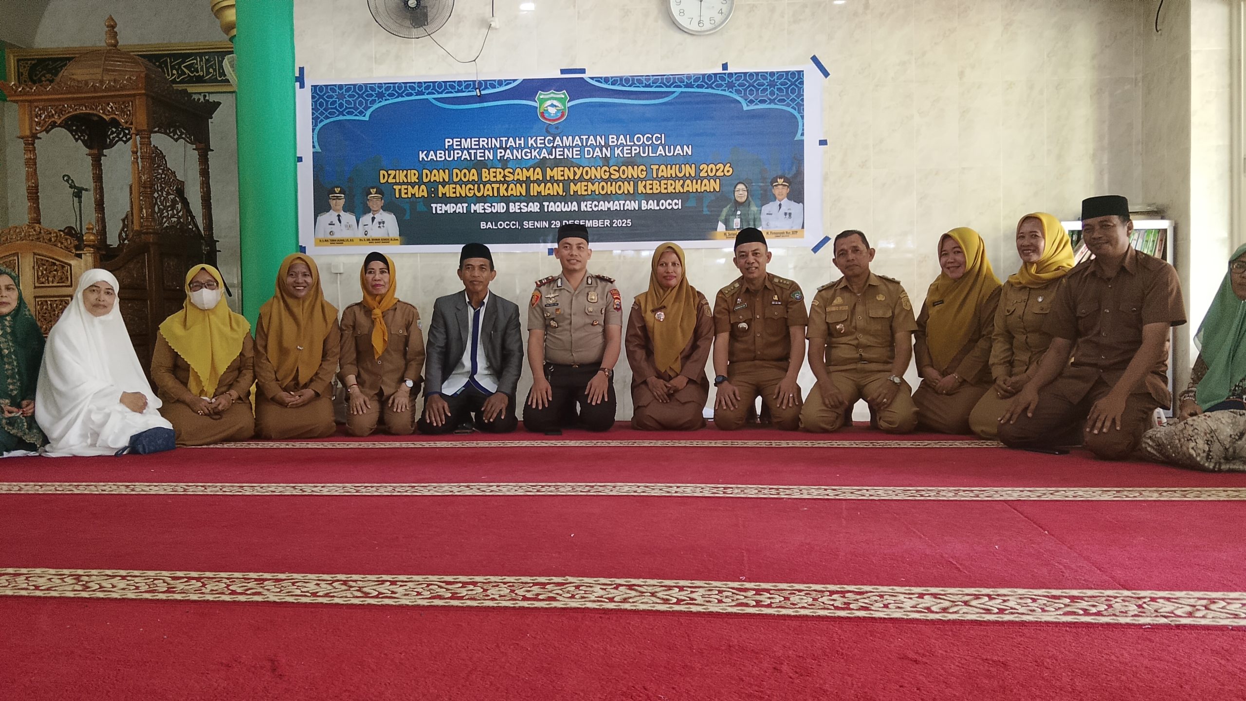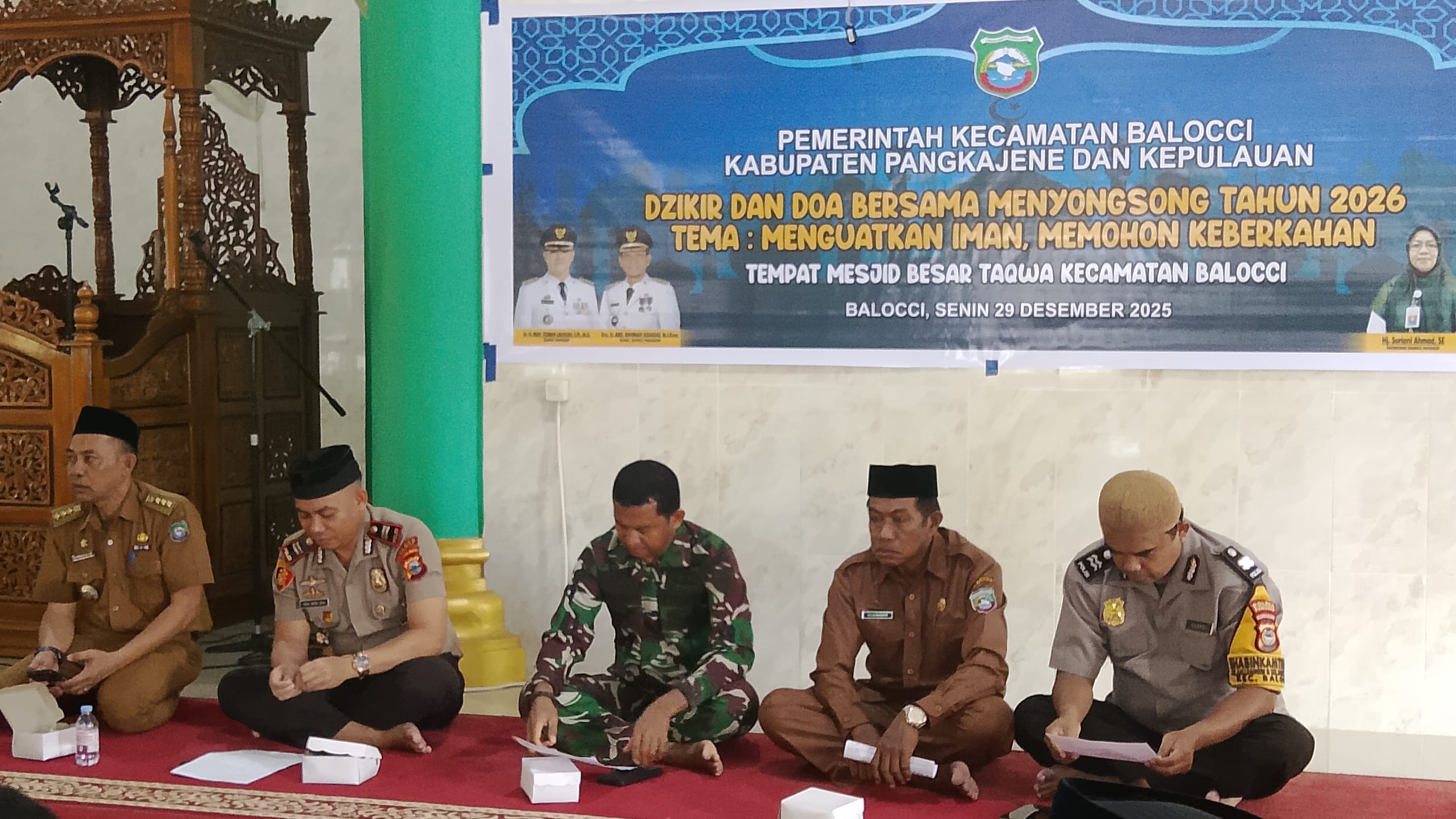 PANGKEP- KLTV INDONESIA klivetvindonesia.com.Balocci, Pangkep — Dalam rangka menyambut pergantian Tahun Baru 2026, Kapolsek Balocci Iptu Agus Indra Jaya bersama sejumlah personel Polsek Balocci menghadiri kegiatan *Dzikir dan Doa Bersama* yang digelar Pemerintah Kecamatan Balocci pada Senin, 29 Desember 2025 bertempat di Masjid Al-Taqwa, Kelurahan Balleangin, Kecamatan Balocci, Kabupaten Pangkep. Kegiatan keagamaan ini turut menjadi ajang memperkuat hubungan kekeluargaan, solidaritas, serta sinergitas antara kepolisian, pemerintah, TNI dan masyarakat.