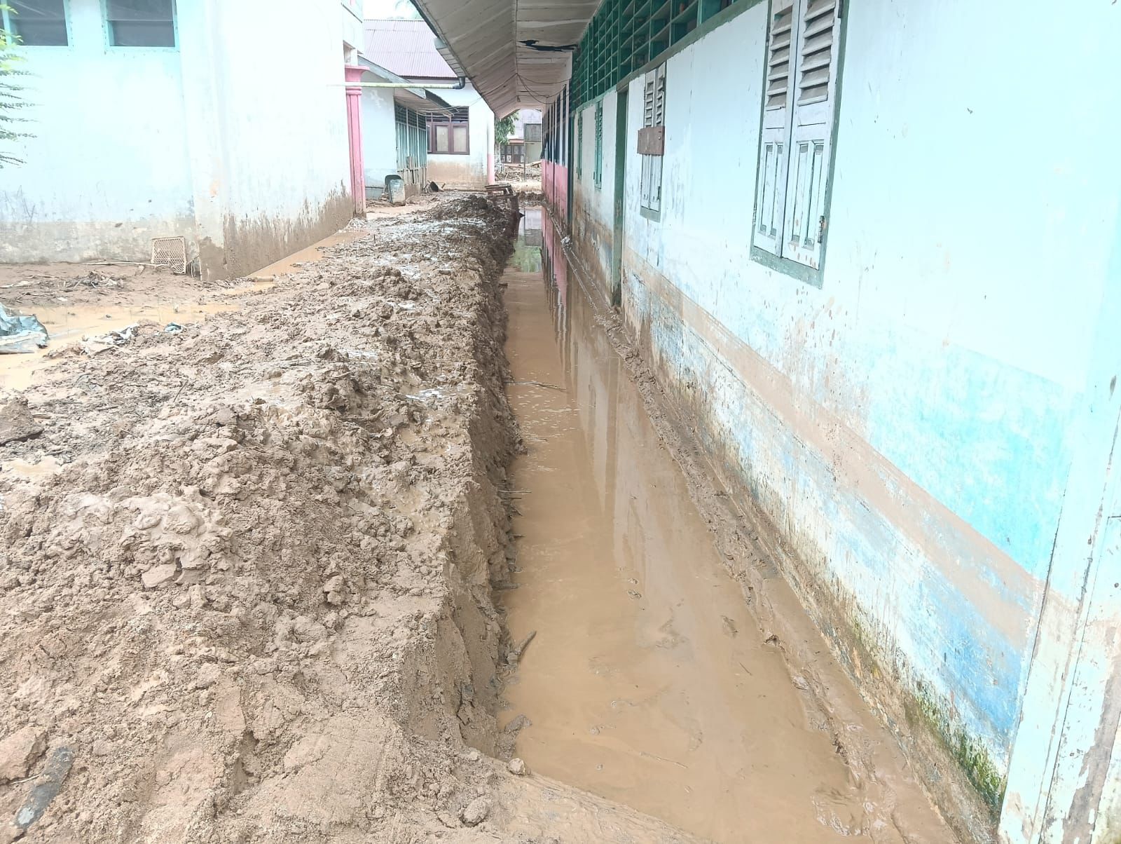 Kegiatan pembersihan tersebut difokuskan pada pengangkatan material tanah dan lumpur yang masuk ke dalam ruangan serta bangunan sekolah akibat banjir, sehingga menghambat aktivitas belajar mengajar.