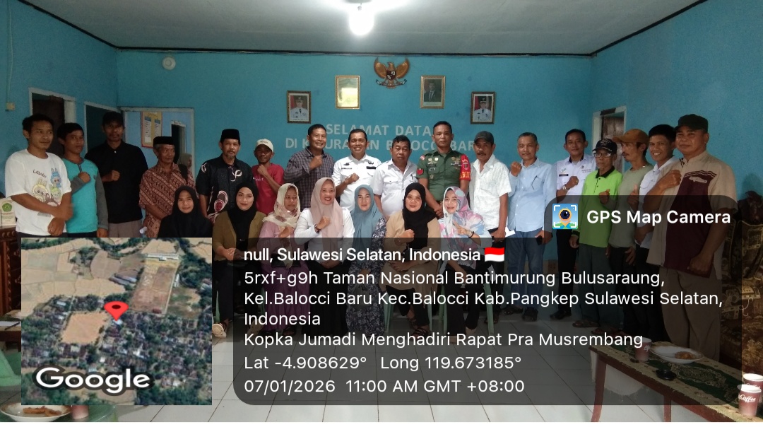 PANGKEP- KLTV INDONESIA klivetvindonesia.com. Balocci, Pangkep — Dalam rangka mendukung proses perencanaan pembangunan yang partisipatif, transparan, dan berkelanjutan, Babinsa Kelurahan Balocci Baru, Kopka Jumadi, menghadiri kegiatan Pra Musyawarah Perencanaan Pembangunan Kelurahan (Pra Musrenbang) yang dilaksanakan pada hari Rabu, 7 Januari 2026, mulai pukul 09.00 Wita. Kegiatan tersebut berlangsung di ruang Kantor Kelurahan Balocci Baru, Kecamatan Balocci, Kabupaten Pangkep.