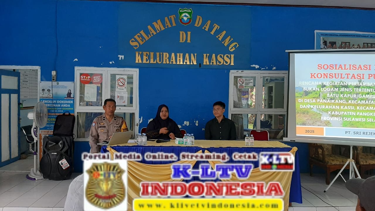 PANGKEP- KLTV INDONESIA klivetvindonesia.com.Balocci Pangkep, ~ Bhabinkamtibmas Kelurahan Kassi Polsek Balocci Polres Pangkep Aipda Amiruddin bersama Babinsa Kelurahan Kassi Serda Haerul serta Lurah Kassi Andi Cenrara, SKM., menghadiri kegiatan Sosialisasi dan Konsultasi Publik yang diselenggarakan oleh PT. Sri Rejeki Bumi. Kegiatan tersebut membahas rencana usaha pertambangan Mineral Bukan Logam jenis tertentu, komoditas Batu Kapur/Gamping, yang direncanakan berlokasi di wilayah Desa Panaikang Kecamatan Minasatene dan Kelurahan Kassi Kecamatan Balocci, Kabupaten Pangkep, Provinsi Sulawesi Selatan.