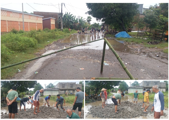 Dengan menggunakan material timbunan berupa pasir dan batu (sirtu), warga secara gotong royong menimbun lubang-lubang besar di badan jalan.
