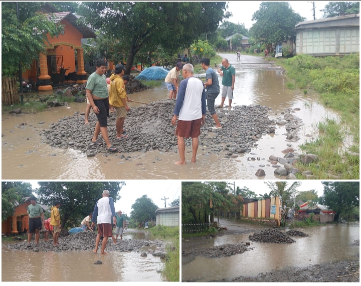 Meski demikian, perangkat desa bersama warga tetap sigap mengambil langkah darurat demi keselamatan pengguna jalan.