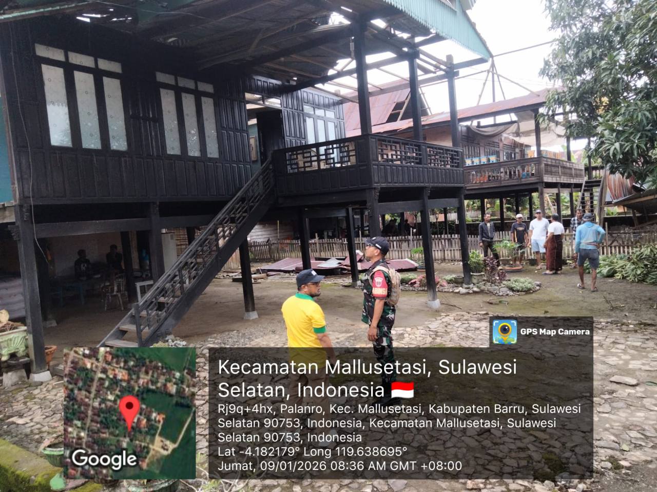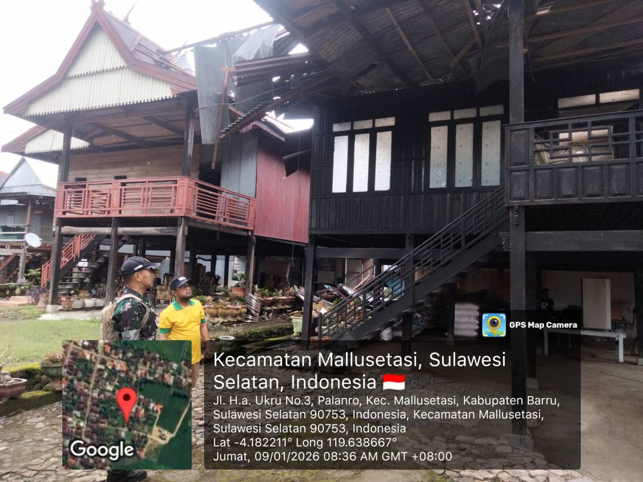 BARRU – KLTV INDONESIA klivetvindonesia.com. Barru – Babinsa Koramil 1405-05/Mallusetasi Kodim 1405/Parepare turun langsung membantu warga Kelurahan Palanro, Kecamatan Mallusetasi, Kabupaten Barru, yang terdampak bencana angin puting beliung pada Sabtu,10 Januari 2026.