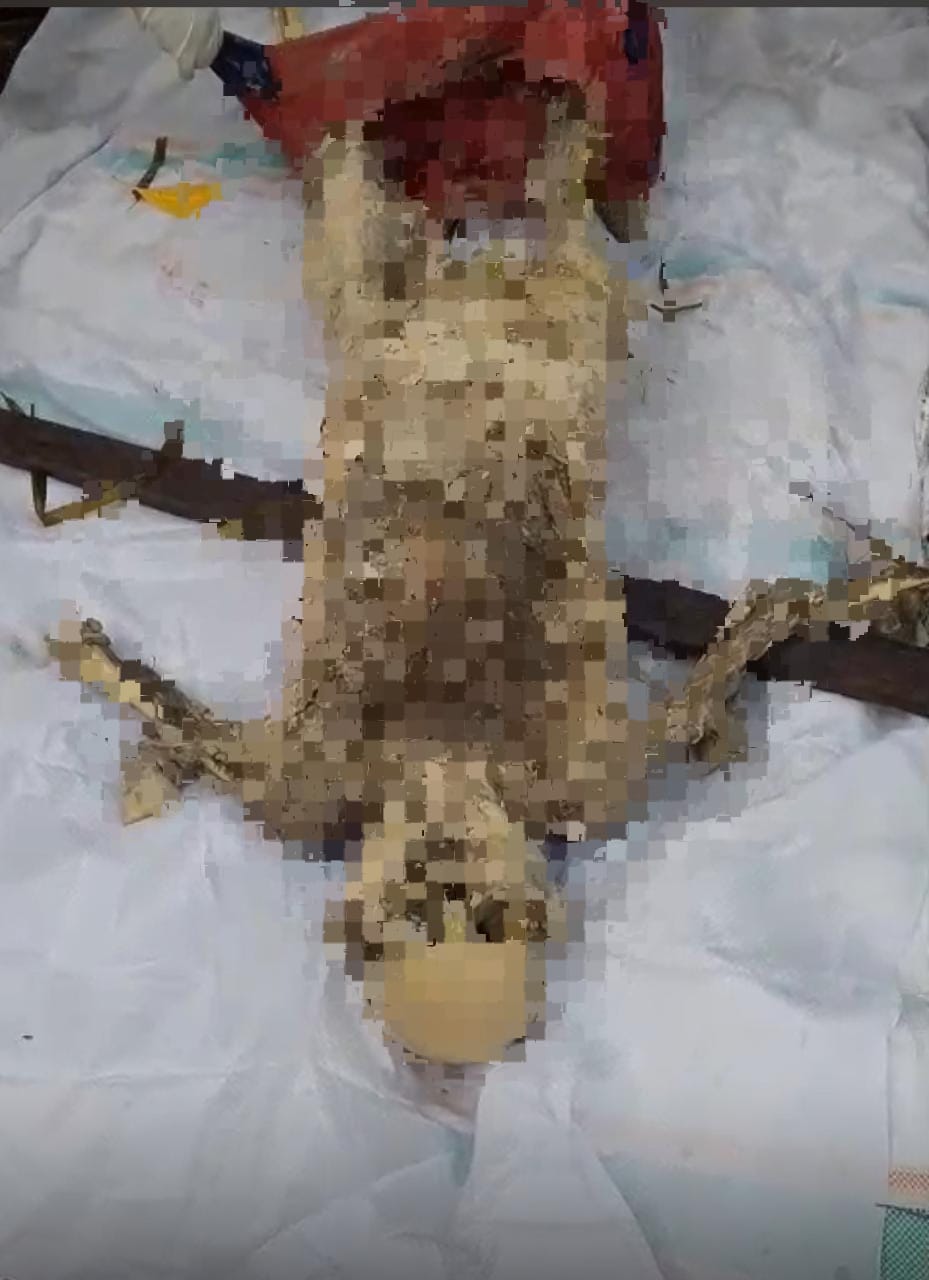 Berdasarkan keterangan awal, korban berjenis kelamin laki-laki dan hingga kini belum diketahui identitasnya. Saat ditemukan, korban hanya mengenakan celana pendek berwarna merah. Sementara itu, kondisi fisik korban sudah sangat memprihatinkan, di mana bagian wajah, lengan, dan kaki tidak lagi dapat dikenali karena sebagian besar tubuhnya telah mengalami kerusakan parah dan diduga sudah dalam kondisi tinggal kerangka.