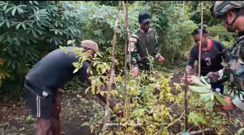 –klivetvindonesia.com– Subin – Personel TNI Pos Subin bersama masyarakat Kampung Subin melaksanakan kegiatan panen bersama sebagai wujud sinergi dan kemanunggalan TNI dengan rakyat, sekaligus mendukung program ketahanan pangan di wilayah Kampung Subin. (14/1/2026)