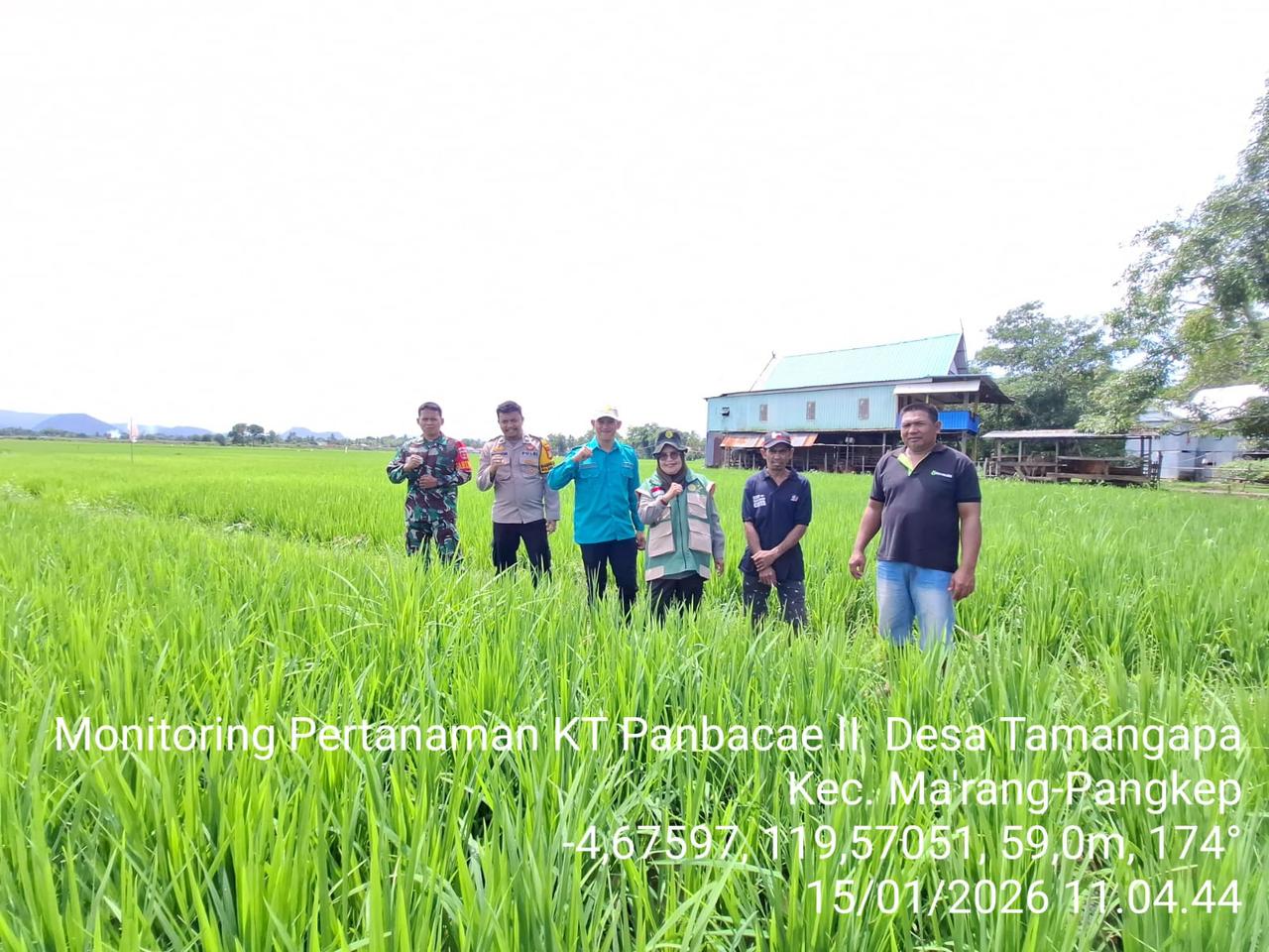 PANGKEP- KLTV INDONESIA klivetvindonesia.com. Ma’rang — Wujud nyata kepedulian terhadap ketahanan pangan dan kesejahteraan petani terus ditunjukkan oleh unsur TNI-Polri di wilayah Kecamatan Ma’rang. Bhabinkamtibmas Desa Tamangapa, Polsek Ma’rang, Briptu H. Rachman bersama Babinsa Koramil 1421-05 Ma’rang melakukan pendampingan kepada Petugas Penyuluh Lapangan (PPL) dan Petugas Pengendali Organisme Pengganggu Tumbuhan (POPT) Desa Tamangapa dalam kegiatan monitoring tanaman padi, Kamis (14/01/2026).