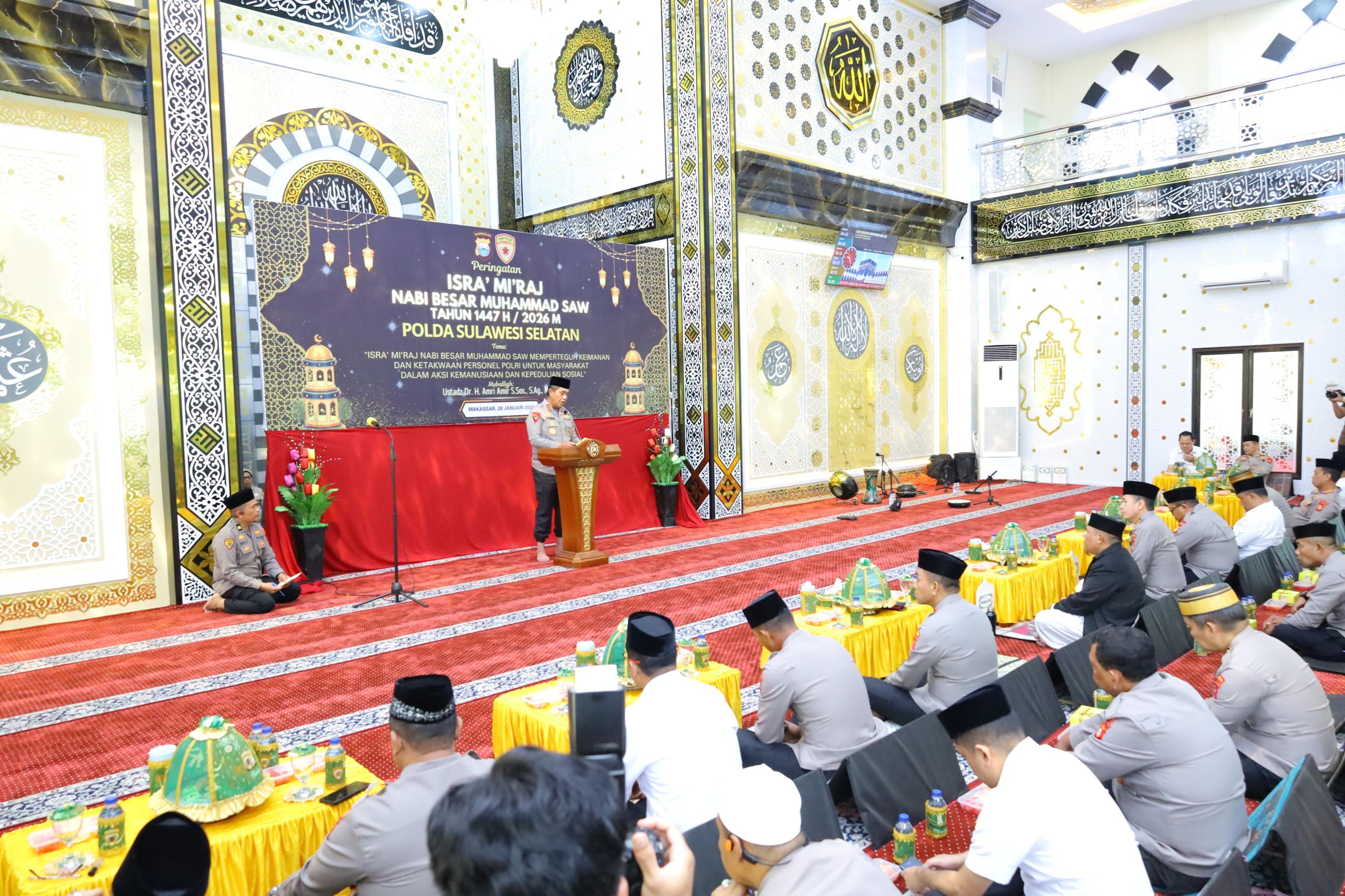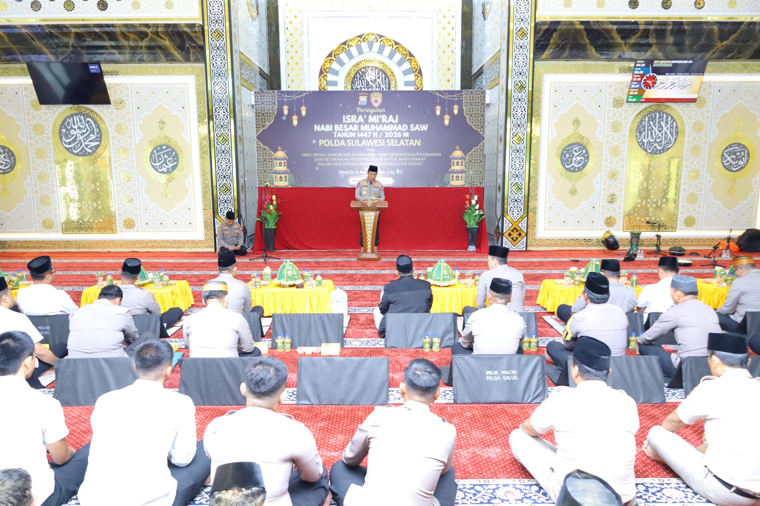 KAPOLDA SULSEL- KLTV INDONESIA klivetvindonesia.com.Polda Sulawesi Selatan menggelar Peringatan Isra Mi’raj Nabi Muhammad SAW Tahun 1447 Hijriah/2026 Masehi di Masjid Nur Syuhada Mapolda Sulsel, Rabu (28/01/2026). Kegiatan keagamaan ini berlangsung khidmat dan penuh makna sebagai sarana meningkatkan keimanan dan ketakwaan personel Polri.