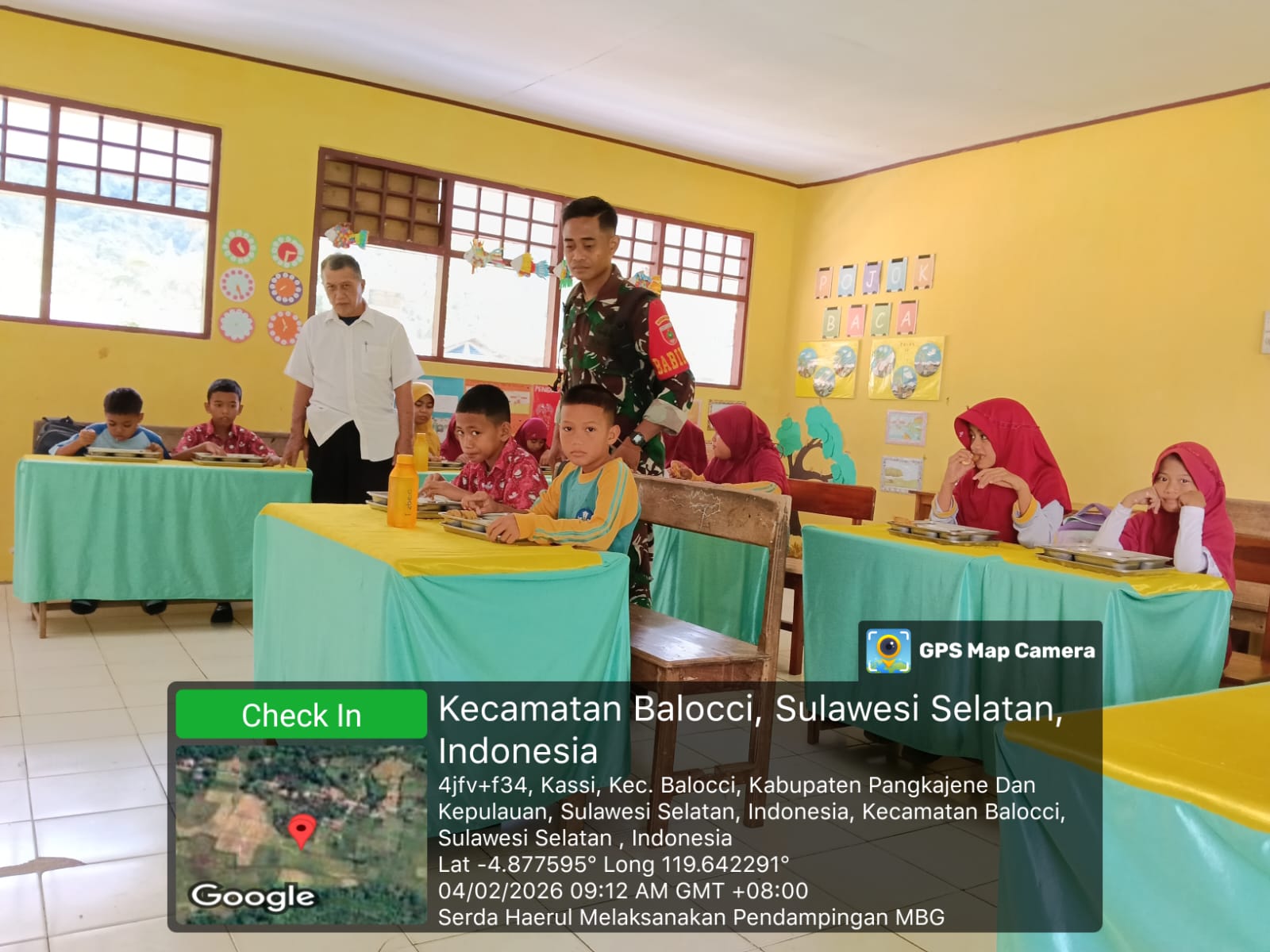 PANGKEP- KLTV INDONESIA klivetvindonesia.com.Pangkep Rabu, tanggal 04 Februari 2026, pukul 09.05 WITA, telah dilaksanakan kegiatan pendampingan Program Makan Bergizi Gratis (MBG) bagi siswa-siswi di wilayah Kelurahan Kassi, Kecamatan Balocci, Kabupaten Pangkep. Kegiatan pendampingan ini dilaksanakan oleh Serda Haerul selaku Babinsa Kelurahan Kassi sebagai bentuk dukungan TNI terhadap program pemerintah dalam meningkatkan pemenuhan gizi anak-anak usia sekolah.
