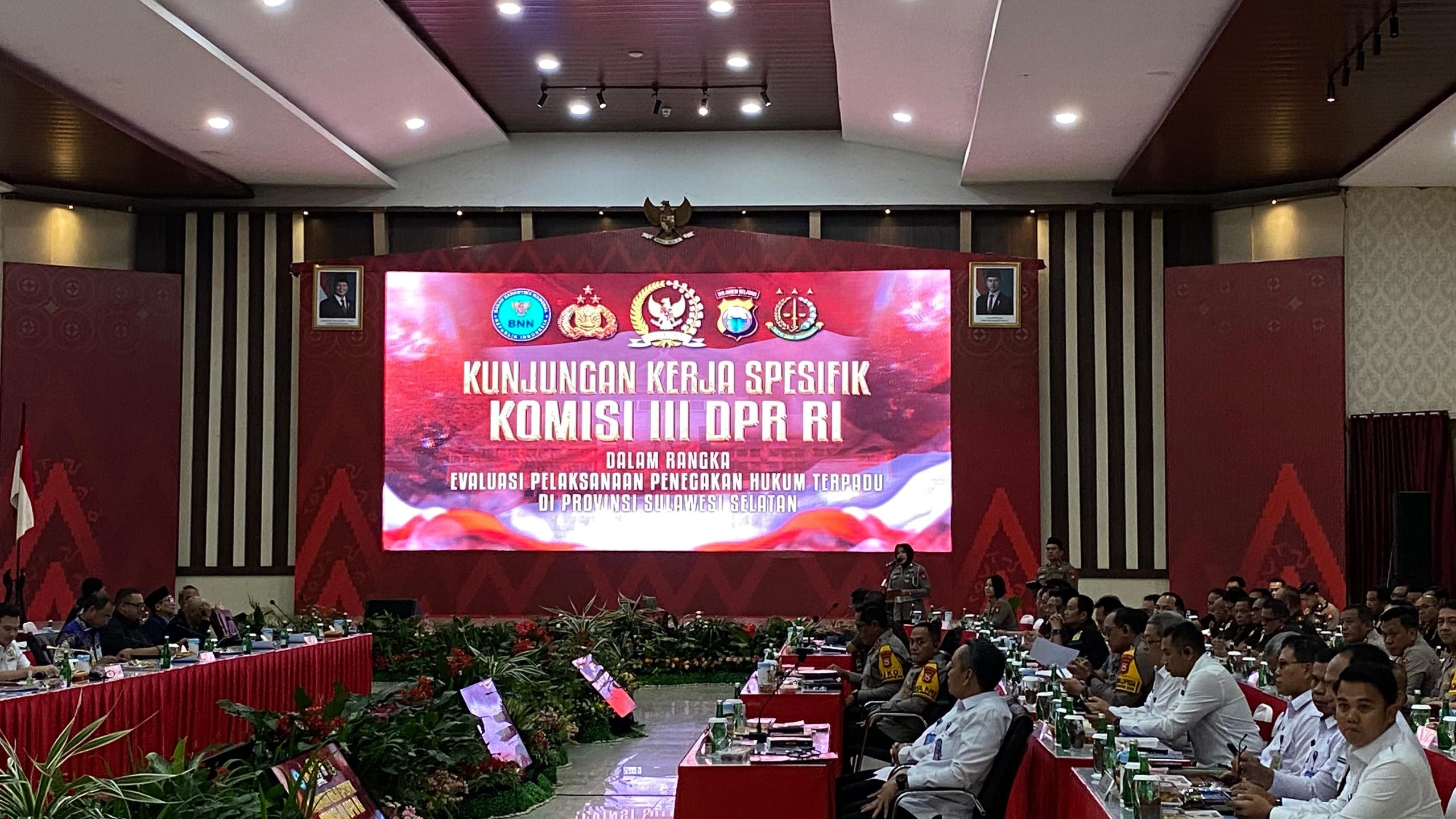 Kegiatan tersebut dipimpin langsung oleh Komisi III DPR RI dan dihadiri Kapolda Sulawesi Selatan yang didampingi Wakapolda Sulsel serta para Pejabat Utama (PJU) Polda Sulawesi Selatan. Turut hadir pula para Kapolres jajaran Polda Sulsel, Badan Narkotika Nasional (BNN) Provinsi Sulawesi Selatan, Kejaksaan Tinggi Sulawesi Selatan, serta para Kepala Kejaksaan Negeri (Kajari) se-Sulawesi Selatan.
