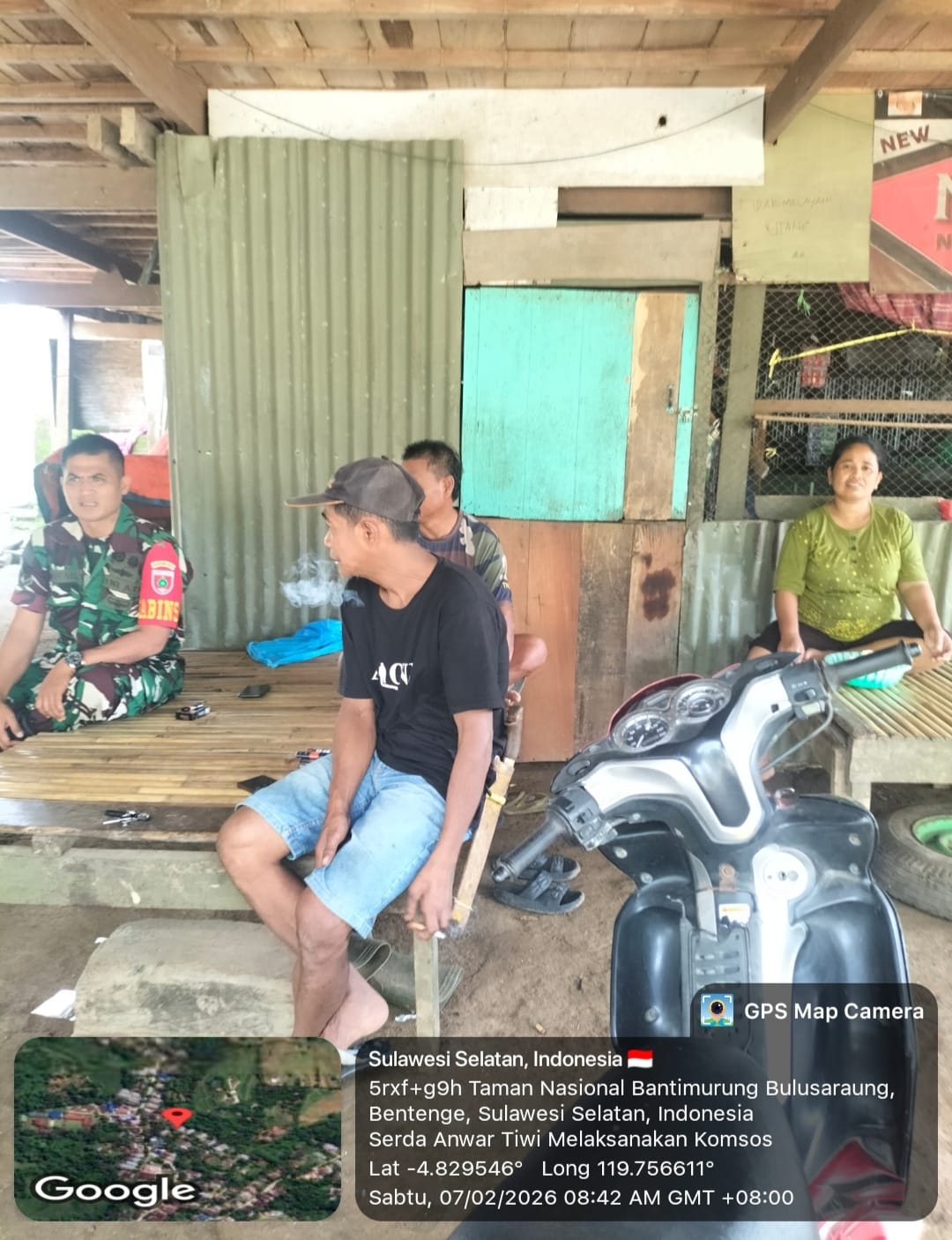 PANGKEP- KLTV INDONESIA klivetvindonesia.com. Tondongkura, Pangkep – Dalam rangka mempererat hubungan silaturahmi serta meningkatkan kesadaran masyarakat terhadap pentingnya keamanan dan kesehatan lingkungan, Babinsa Desa Tondongkura, Serda Anwar Tiwi, melaksanakan kegiatan Komunikasi Sosial (Komsos) bersama warga Dusun Bonto Manai, Desa Tondongkura, Kecamatan Tondong Tallasa, Kabupaten Pangkep, pada hari Sabtu, 7 Februari 2026.