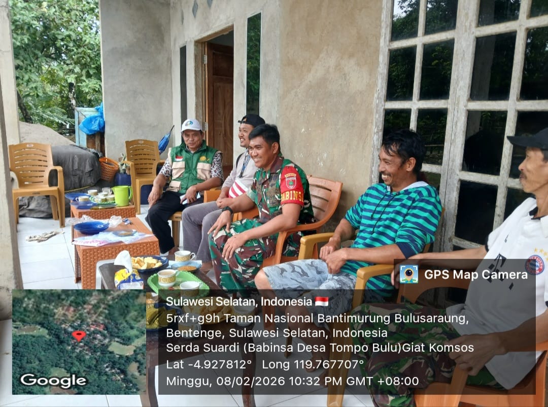 PANGKEP- KLTV INDONESIA klivetvindonesia.com.Minggu, tanggal 08 Februari 2026, sekitar pukul 10.05 Wita, Babinsa Desa Tompo Bulu, Serda Suardi, melaksanakan kegiatan Komunikasi Sosial (Komsos) bersama warga di rumah Bapak Najamuddin, yang berlokasi di Kampung Bulu-Bulu, RT 02 RK 01 Dusun 01 Bulu-Bulu, Desa Tompo Bulu, Kecamatan Balocci, Kabupaten Pangkep.