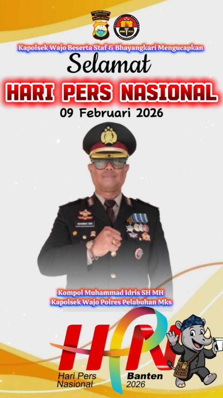 Peringatan Hari Pers Nasional (HPN) yang jatuh setiap 9 Februari kembali menjadi momentum refleksi bagi seluruh insan pers dan pemangku kepentingan. Dalam peringatan HPN 2026, Kapolsek Wajo Polres Pelabuhan Makassar, Kompol Muhammad Idris, SH, MH, menyampaikan ucapan selamat sekaligus apresiasi atas kontribusi pers dalam kehidupan berbangsa dan bernegara, Senin (9/2/2026).