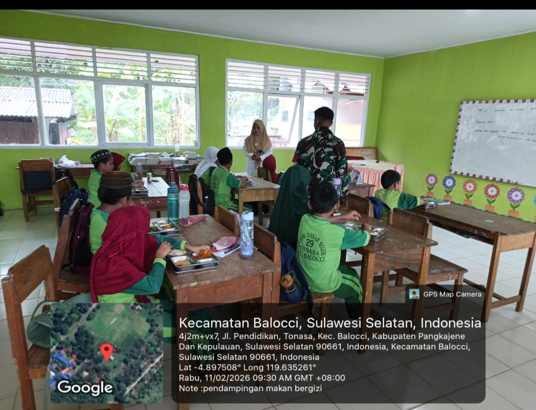 PANGKEP- KLTV INDONESIA klivetvindonesia.com.Pangkep Rabu tanggal 11 Februari 2026 sekitar pukul 09.20 Wita, Serda Suhardi selaku Babinsa Kelurahan Tonasa melaksanakan kegiatan pendampingan program Makan Bergizi Gratis (MBG) bagi siswa-siswi SDN 29 Tonasa 1 yang berlokasi di Kelurahan Tonasa, Kecamatan Balocci, Kabupaten Pangkep. Kegiatan ini merupakan bagian dari dukungan TNI terhadap program pemerintah dalam upaya meningkatkan asupan gizi anak sekolah guna menunjang kesehatan, pertumbuhan, serta kemampuan belajar mereka.