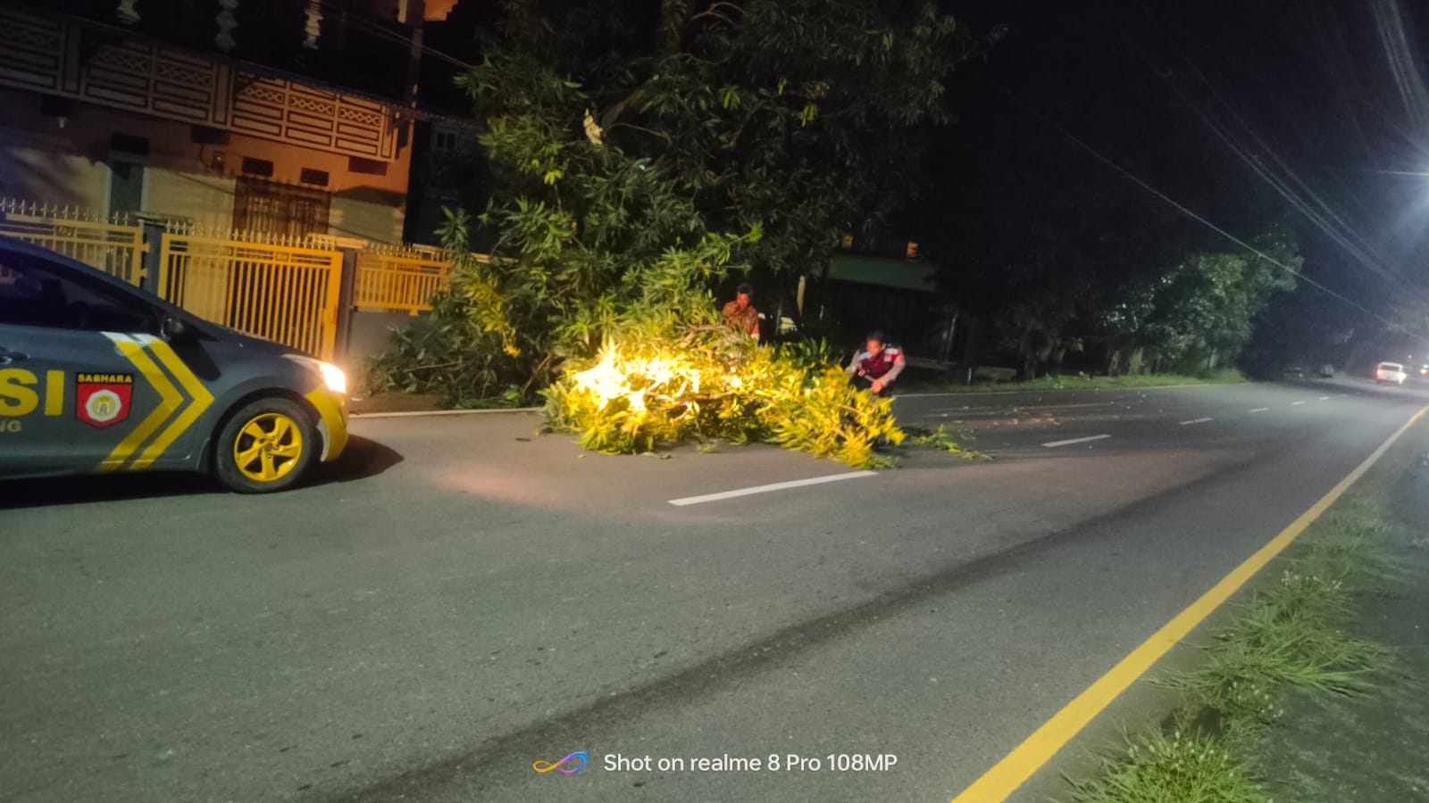 Dengan sigap, kedua personel langsung turun tangan memotong dan menyingkirkan ranting pohon tersebut dari badan jalan. Tindakan cepat itu dilakukan demi mencegah terjadinya kecelakaan lalu lintas dan memastikan arus kendaraan tetap lancar.
