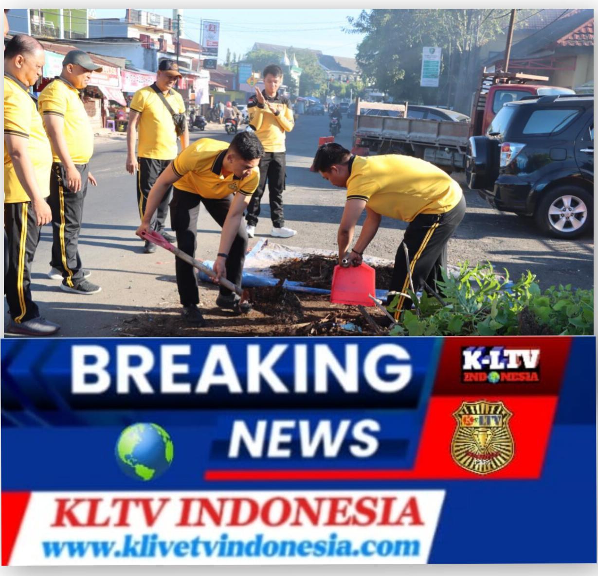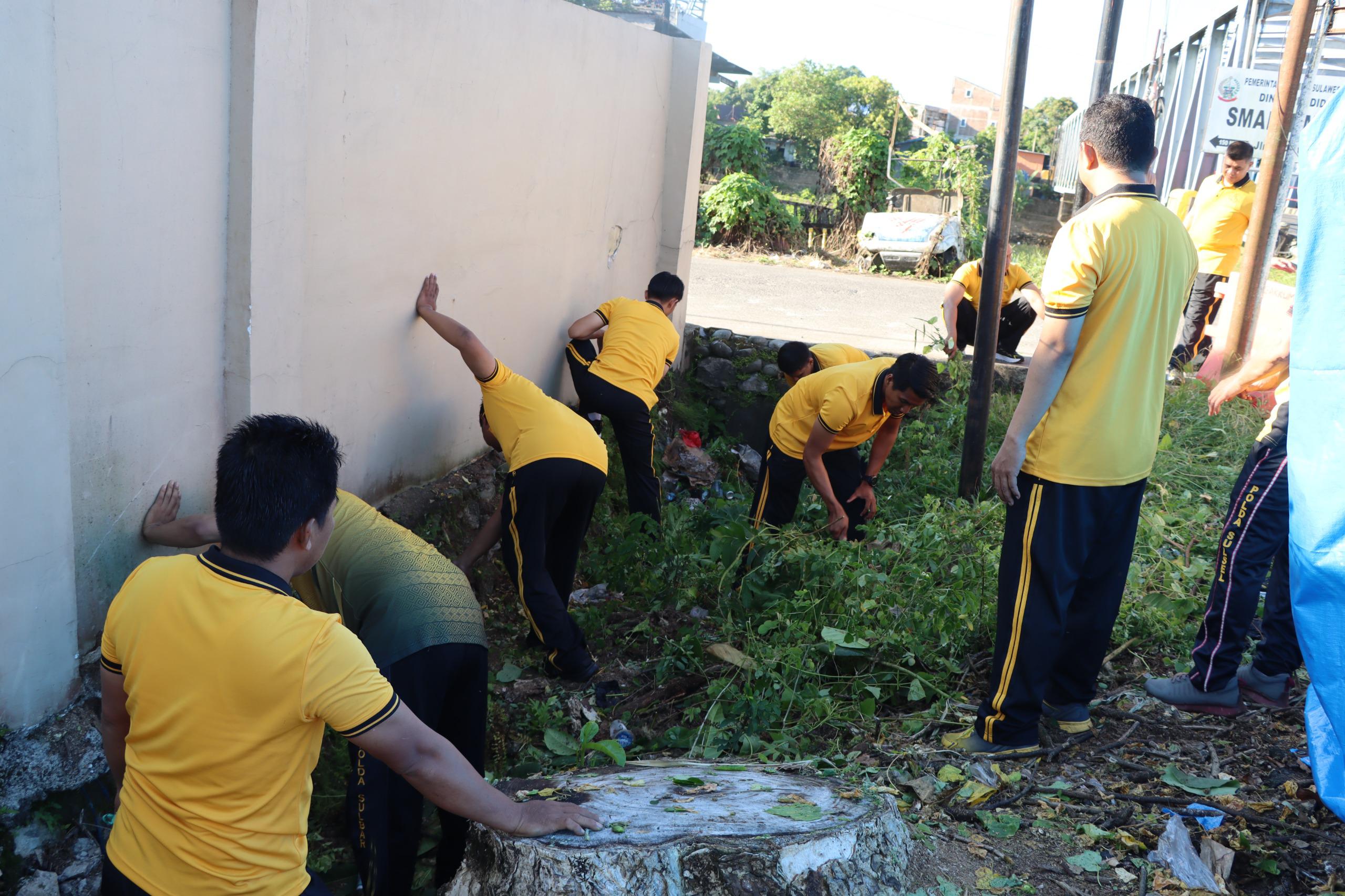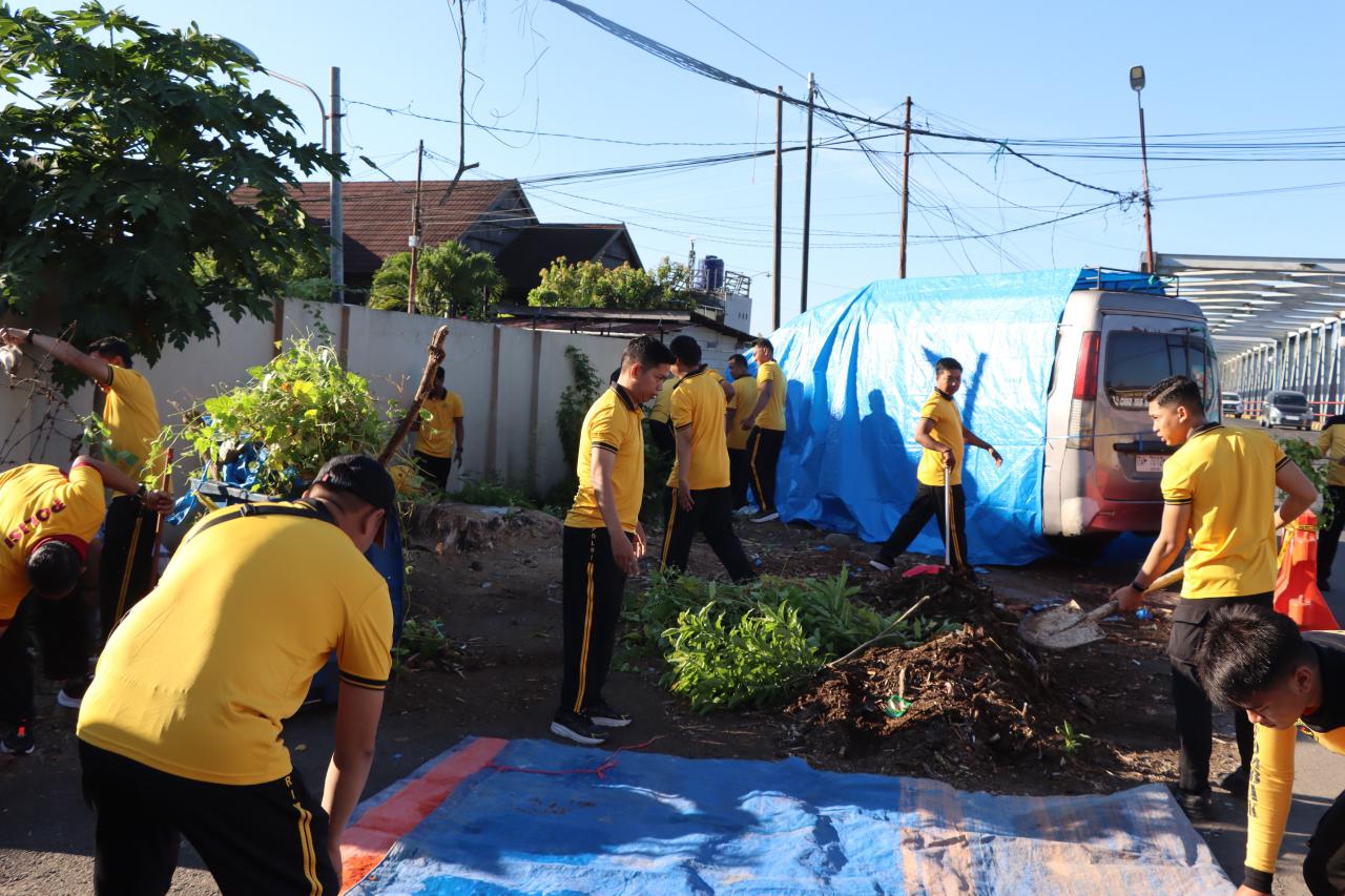Personel tampak kompak membersihkan halaman, merapikan taman, serta mengumpulkan sampah di area sekitar mako guna menciptakan lingkungan yang bersih dan nyaman.