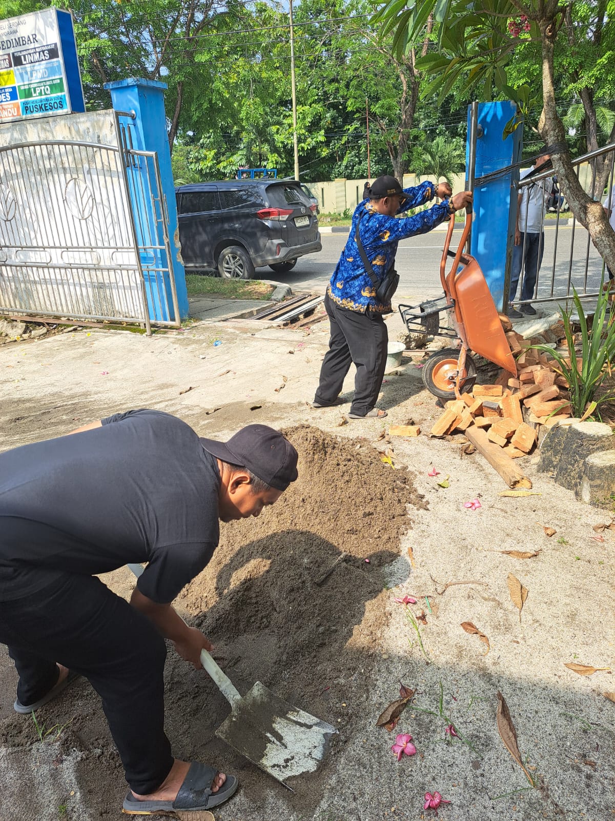 Di tengah polemik tersebut, aktivitas pemerintahan desa tetap berjalan normal. Termasuk kegiatan gotong royong yang dilakukan oleh perangkat desa bersama warga dalam memperbaiki pagar dan titi parit kantor desa yang rusak akibat ditabrak truk pengangkut sembako pada awal April lalu.