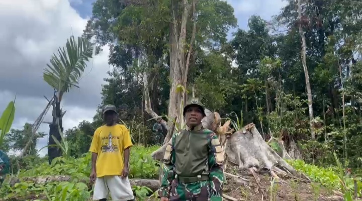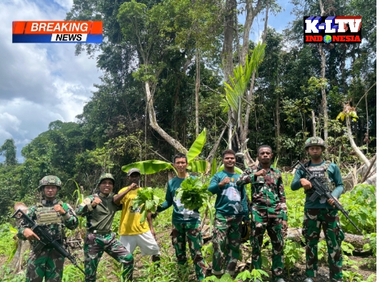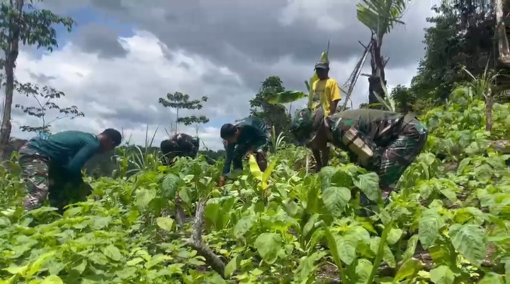 –klivetvindonesia.com– Maybrat, Papua Barat Daya — Bentuk aplikasi kegiatan teritorial dengan masyarakat sekitar, Satgas Pamtas RI-PNG Kewilayahan Yonif 763/SBA Pos Afkrem melaksanakan panen hasil kebun bersama masyarakat Kampung Afkrem. (20/4).