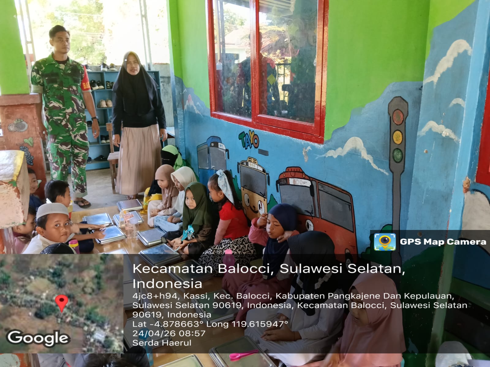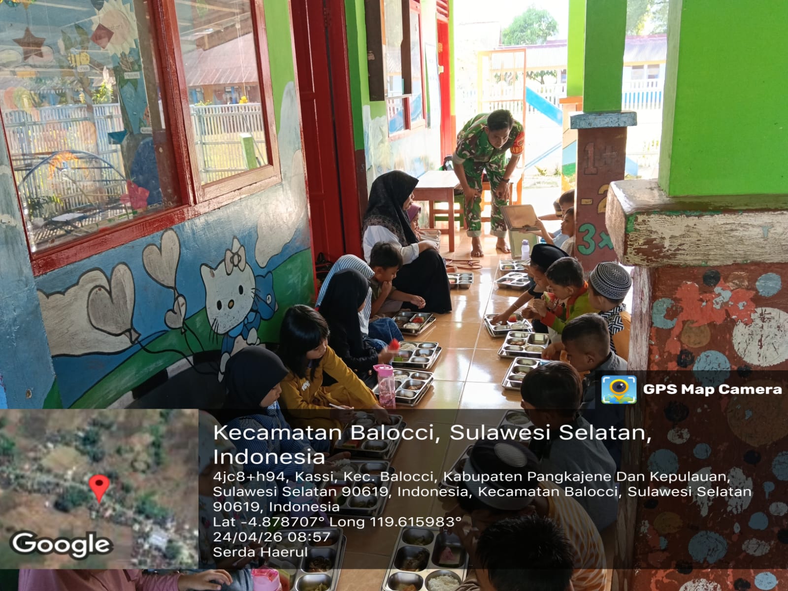 PANGKEP- KLTV INDONESIA klivetvindonesia.com.Pangkep – Dalam rangka mendukung program pemerintah dalam peningkatan gizi anak usia dini, Babinsa Kelurahan Kassi, Serda Haerul, melaksanakan kegiatan pendampingan Makan Bergizi Gratis (MBG) bagi siswa-siswi KB (Kelompok Bermain) Melati yang bertempat di Kelurahan Kassi, Kecamatan Balocci, Kabupaten Pangkep, pada Jumat, 24 April 2026.